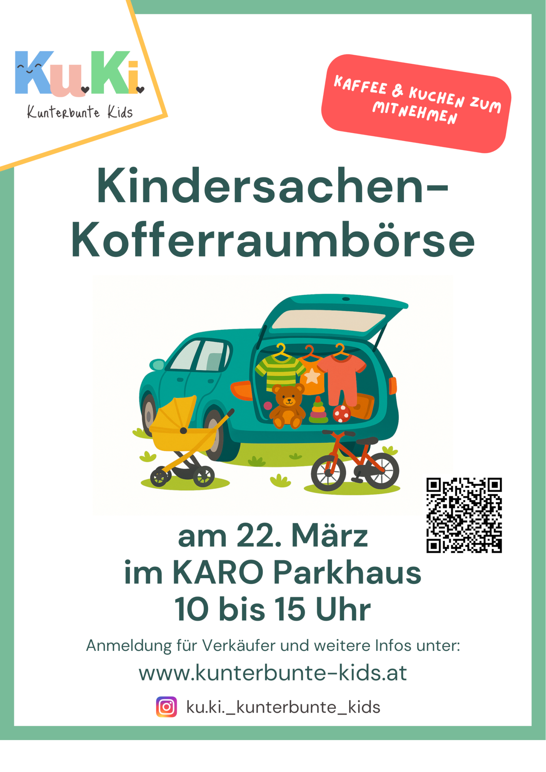 Du hast viele Kindersachen und möchtest diese gerne verkaufen? Dann pack alles in den Kofferraum und komm am 22. März zur Kindersachen-Kofferraumbörse nach Bischofshofen ins Parkhaus vom KARO Bischofshofen. Du hast zwei Parkplätze zur Verfügung und kannst diese so gestalten, wie du möchtest. Du kannst direkt aus dem Kofferraum raus verkaufen und/oder du nimmst selber […]